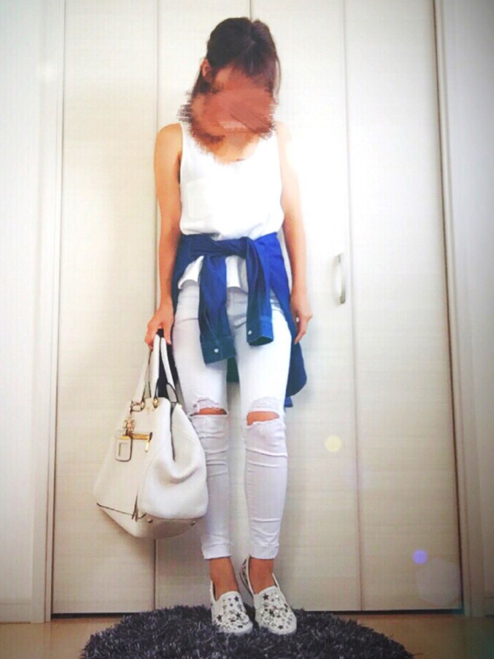 始めたばかりで使い方やマナーがイマイチわかりません…orz 申し訳ございません´д` ; いいね!やセーブをしてくださり、ありがとうございます。 オールホワイトコーデ。 少しでも脚を長く見せるために、ダンガリーシャツを腰よりやや高めに巻いております。 あえてのブルーを入れる事によって、目の錯覚で腰高に見せる!← 靴は遊び心で星のスタッズ☆ シンプルだけど遊び心ある感じにしてみました。