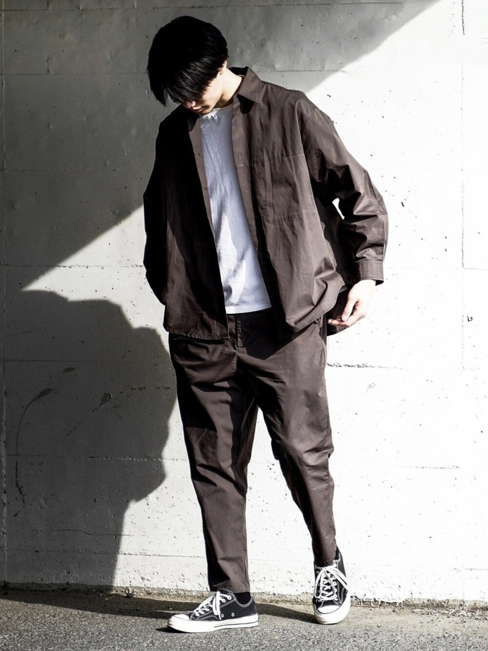 ヨシカズのセットアップ「【nowm】TYPEWRITER LOOSE BOX SLIT POCKET SHIRT& BALLOON TAPERED PANTS SET-UP / タイプライター シャツセットアップ」を使ったコーディネート