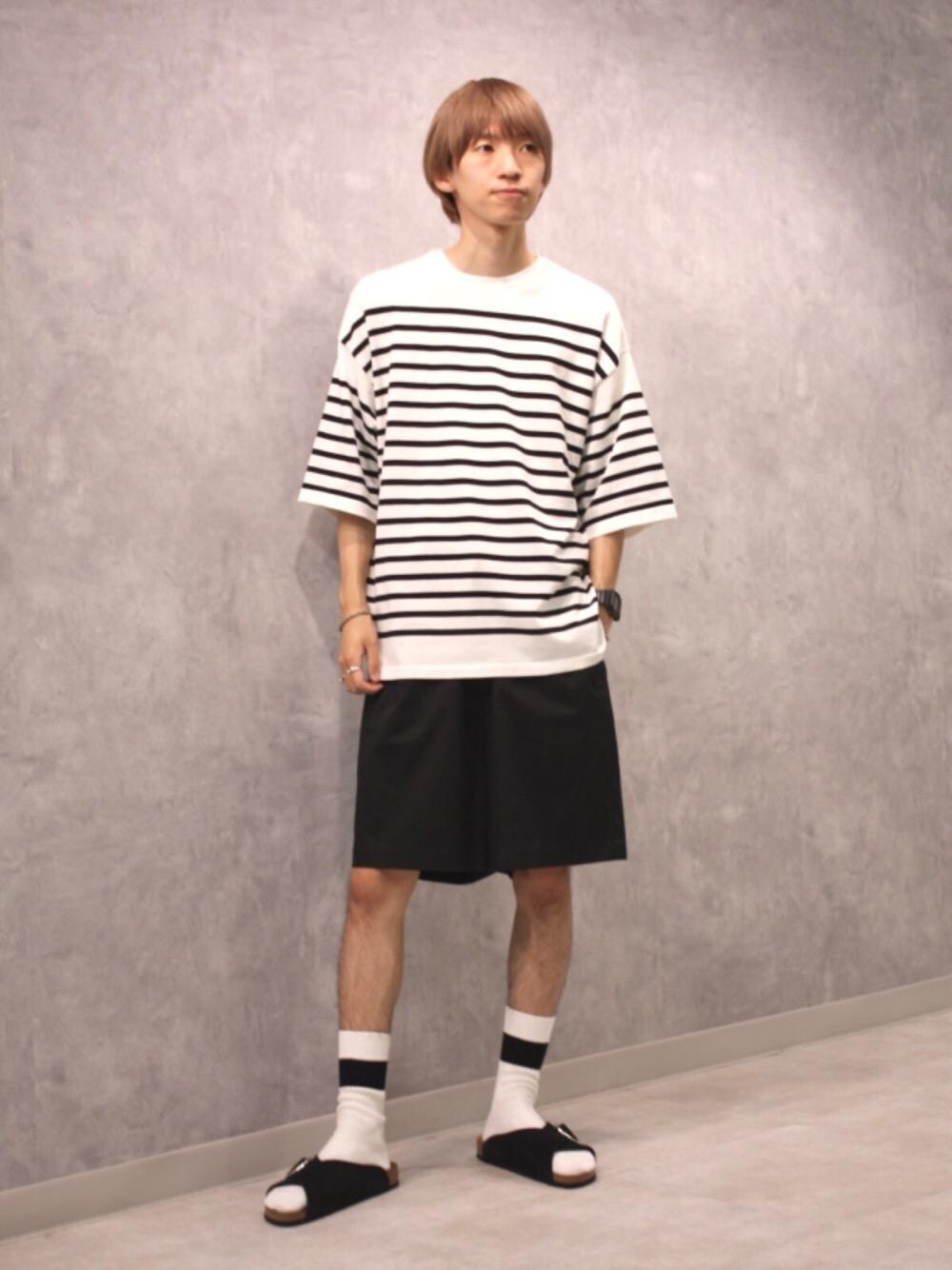 ●身長 178cm ●普段のサイズ トップス/L ボトムス/M or L シューズ/27cm 【素材感】 トップス/滑らかな肌触りのニットです。 パンツ/適度にハリがあり、薄めの生地です。 【サイズ感】 トップス/ゆったりめ ボトムス/ゆったりめ 【着心地】 トップス/生地が柔らかくゆったりしたサイズ感なので、肩肘張らないリラックスできる着心地です。 ボトムス/ウエストがゴムと紐のイージー仕様で、ワイドシルエットなため肌に付かず快適に穿いて頂けます。 【コーディネートポイント】 オーバーサイズのニットTシャツは品の良い表情が出る為、オーバーサイズが苦手な方でもチャレンジしていただきやすいアイテムです。パンツと足元は夏らしくショーツとサンダルで合わせ、ニットTシャツに合わせてソックスもラインが入っている物を選びました。