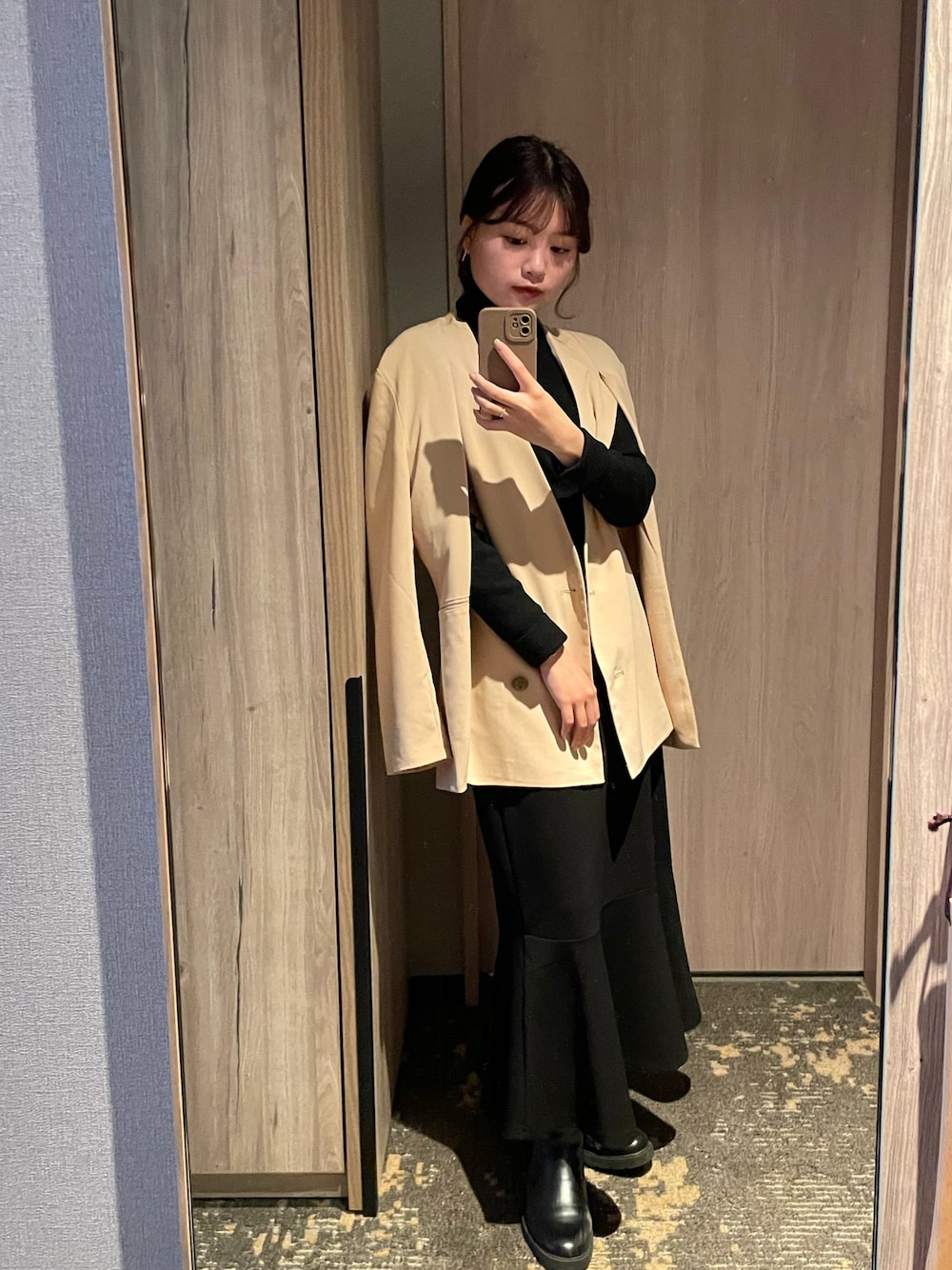タートルとマーメイドスカートを同じ色にして ワンピースっぽく着てみました👗✨ スリット入りのジャケットは 綺麗めな雰囲気になるからお気に入り😌 【Instagram】@k.ya_9