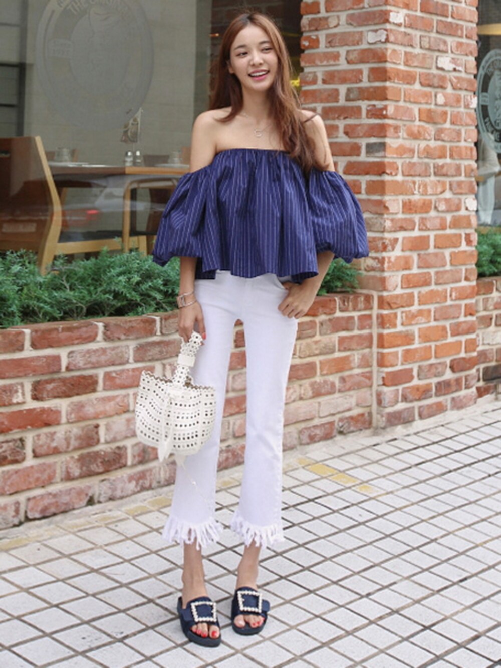 11AMのシャツ/ブラウス「ストライプオフショルダーブラウス」を使ったコーディネート