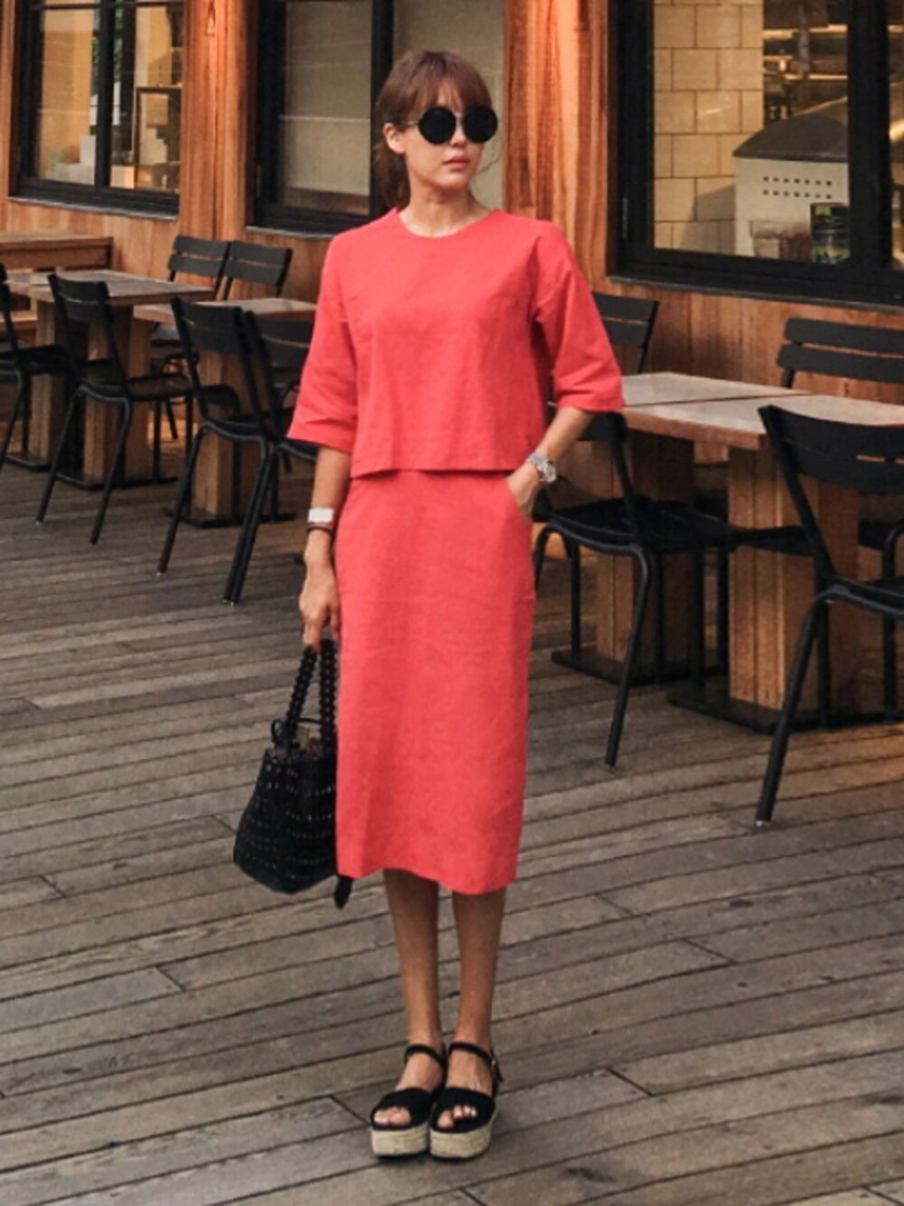 11AMのワンピース「リネンミックスシンプルトップ×ミディスカートSET」を使ったコーディネート