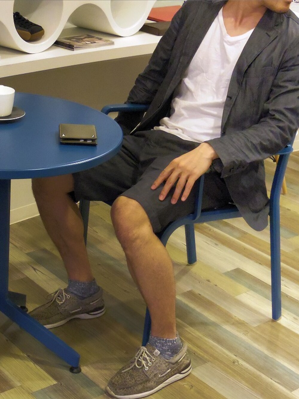 当店併設のカフェにてぱしゃり。 薄地のデニムセットアップにデッキシューズで夏到来といった感じです(^^) デッキシューズには敢えて、くるぶしよりほんのちょっと高さがありウェアと同系色のソックスを履きシューズをさらに引き立てました~ ヴァレンティノのスタッズウォレットでお会計も進んでエンジョイン☆