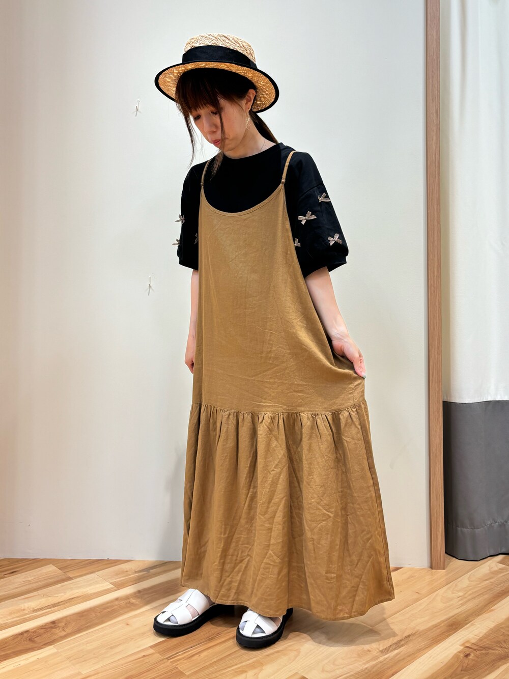 Tシャツとキャミワンピの シンプルコーデ♪ 袖のリボンでコーディネートに 可愛さをプラスしてみました♡