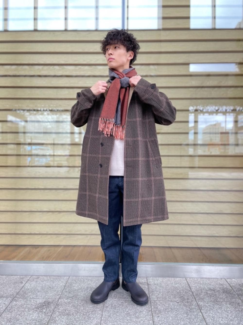 全体的にベージュ・ブラウンのカラーでコーディネートし、オレンジカラーのマフラーで秋冬の洋服に暖かみをプラスしました! ブーツはサイドゴアデザインやステッチの印象もありお洒落に使いやすいということに加え、雨天にも強い構造になっているので冬に向けて持っておきたい一足です。