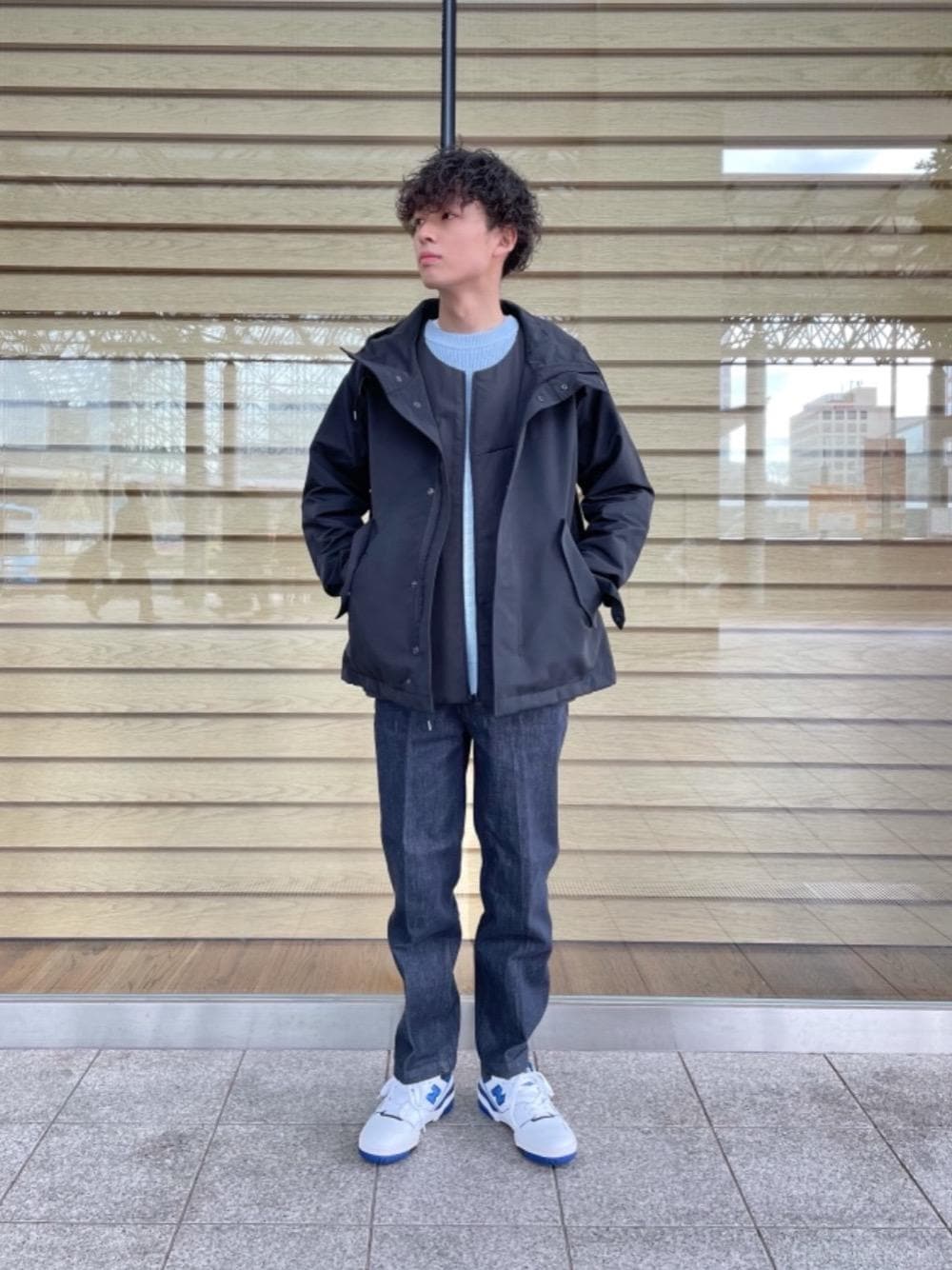 アゼニットの新色ターコイズカラーです。 爽やかなブルーでコットン生地ということもあり、今から春まで長く着ていただけます! ブルー×ブラックをコンセプトに、足元にホワイトのスニーカーで軽やかな印象にしました。