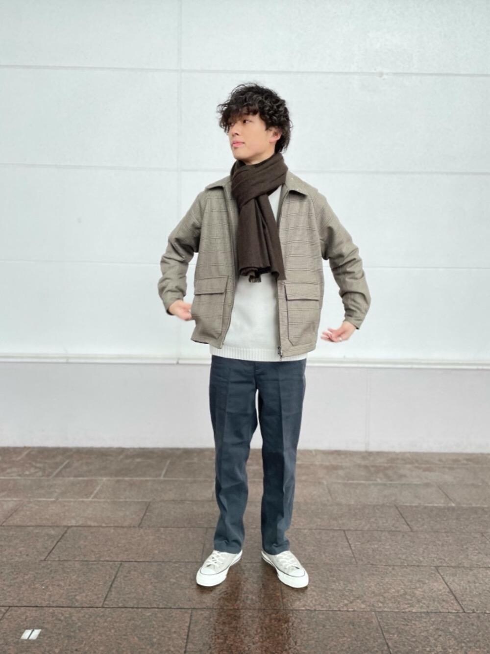 グレー×ブラウンをベースにコーディネートしました。 ブルゾンは中綿入りで、インナーにニットを合わせ今の時期でも寒くない組み合わせでオシャレを楽しめます! 類似の中綿ブルゾンも着ていますので是非ご覧ください。