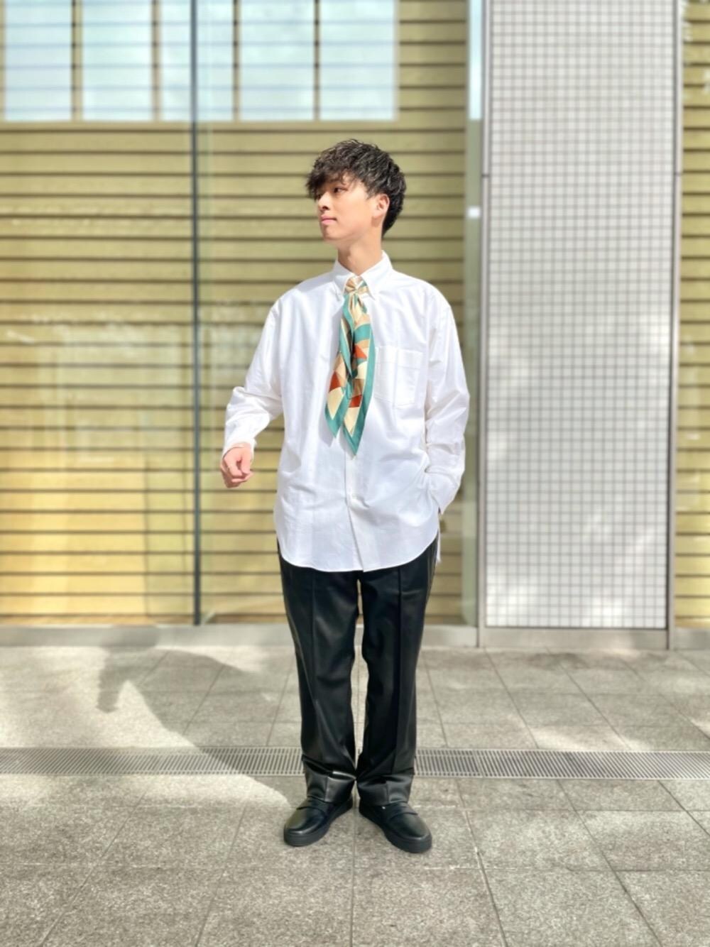 ビッグシルエットのホワイトシャツにスカーフとリングを使いネクタイ風に巻き、シンプルなコーディネートのなかに春の彩りを加えました。 シャツはMサイズで、ビッグシルエットとということもあり着丈が特に長い印象です。 スカーフ、リングはともにウィメンズの品物ですが、男性がコーディネートのアクセントになるように使うこともできるのでぜひご覧ください。