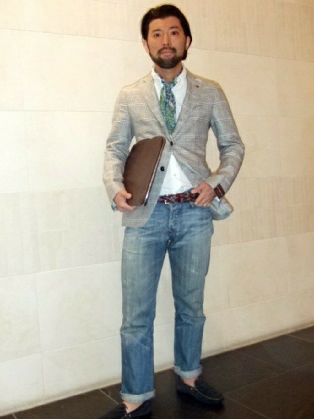 今回のコーディネイトは爽やかなリネンのジャケットにデニムの定番スタイルです。 POINTは足元のドライビングシューズで,これからの季節は素足で履いたりと初夏を感じさせる一足になります。また、ビジネスカジュアルなスタイルやこれからのお出かけシーズンにピッタリなアイテムですので是非ともトライしてみては!!オススメですよ。
