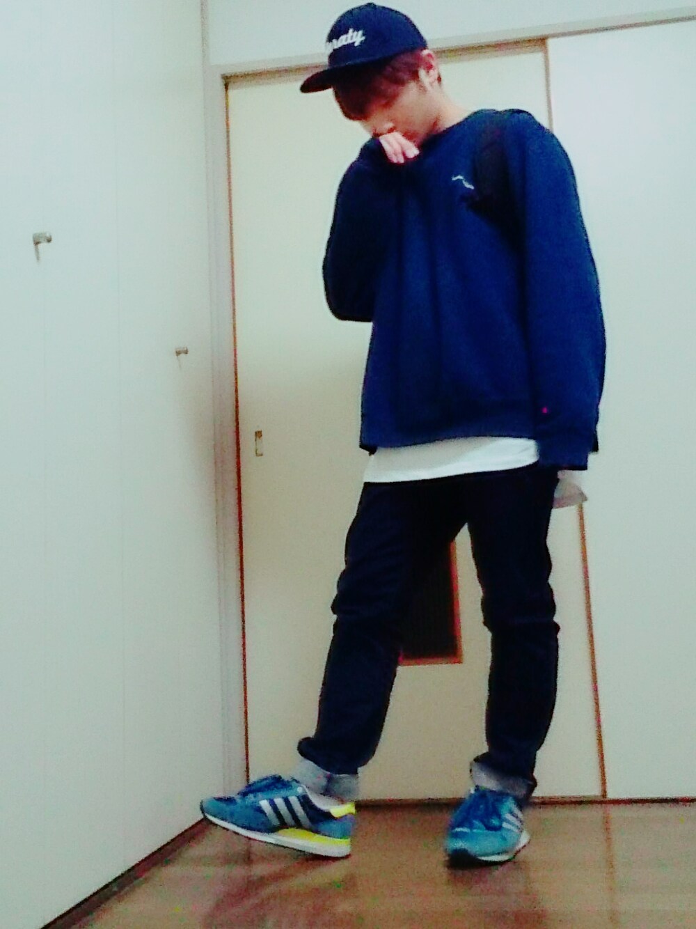今日はネイビーコーデ スニーカーも同系色のブルーにして championオーバーサイズのスウェットにコムサのロング丈Tを合わせました さすがに寒かったです笑 どうやったら写真でデニムが伝わるんだろ笑