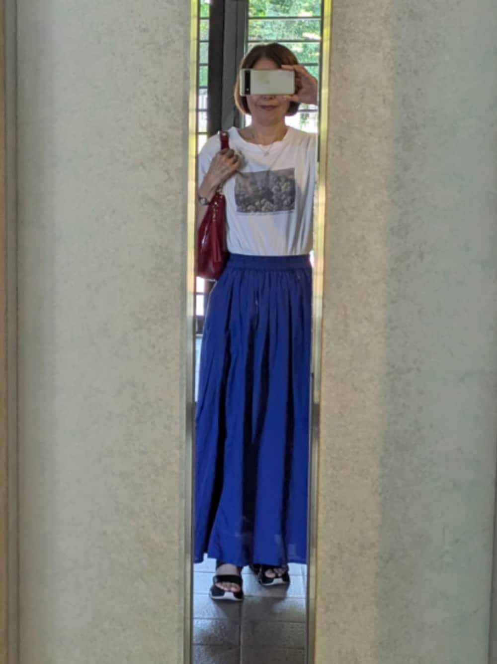休日の映画鑑賞👀 白Tにブルーのロングフレアスカートで引き締め、お出かけ着に👯