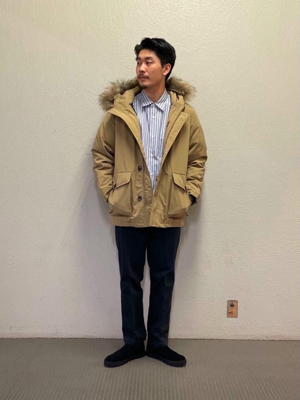 シャツ、スラックス、革靴のきれいめな雰囲気をアウターと配色でカジュアルダウンしました。