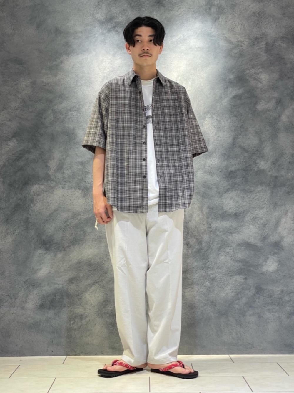【身長】180cm(標準体型) 【普段サイズ】L/XL シューズ27.5/28.0cm 【サイズ感】 トップス:横幅にゆとりがあり、それに対し、丈感はスッキリめです。 インナー:全体的にゆとりがあり、一枚着でも使いやすいです。 ボトムス:ワイドシルエットで程よくテーパードがかかっています。 シューズ:標準的です。 【素材感/着心地】 トップス:生地感はサラッとしていて軽快な雰囲気ですが、程よい厚みがあり、生地の落ち感が上品な印象です。 ボトムス:表面に細かな凹凸のある生地感で、通気性も良く、時期的にも使って頂きやすいです。 【コーディネートポイント】 全体的にモノトーンでまとめて、足元で清涼感と差し色を演出しました。