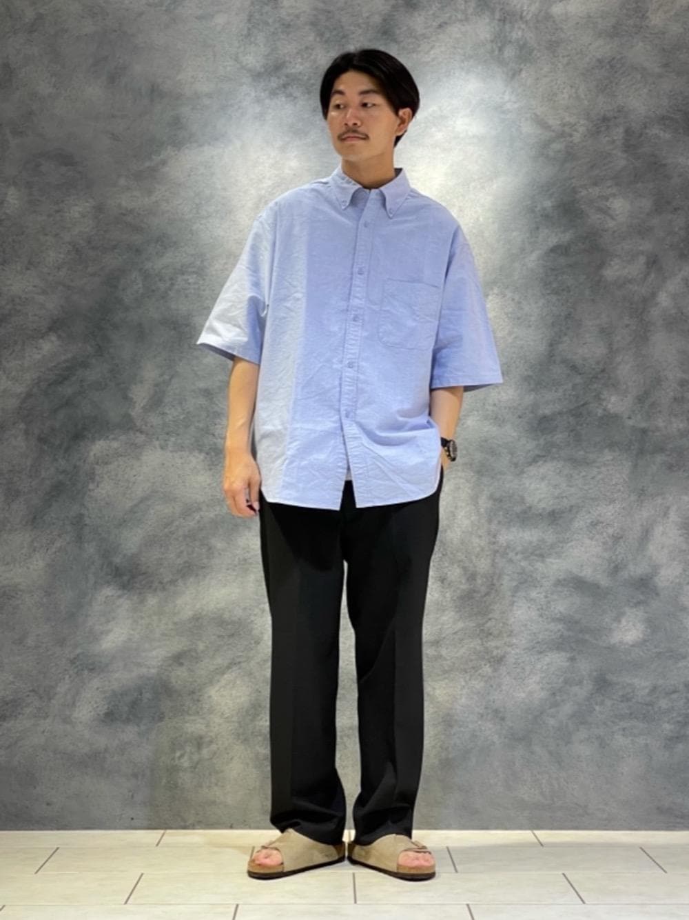【身長】180cm(標準体型) 【普段サイズ】L/XL シューズ27.5/28.0cm 【サイズ感】 トップス:全体的にゆとりのあるサイズ感で、丈感はスッキリめなサイズです。 ボトムス:ワイドシルエットで程よいテーパードが効いてます。 シューズ:標準的です。 【素材感/着心地】 トップス:ハリのあるコットン地で肌離れが良く、この時期でも快適に着ていただけます。 ボトムス:程よい光沢感と厚みのある生地感です。 【コーディネートポイント】 サイズ感と素材感がカジュアルなシャツに、光沢感とセンタープレスのあるボトムスを合わせて、キレイめとカジュアルのバランスを取りました。