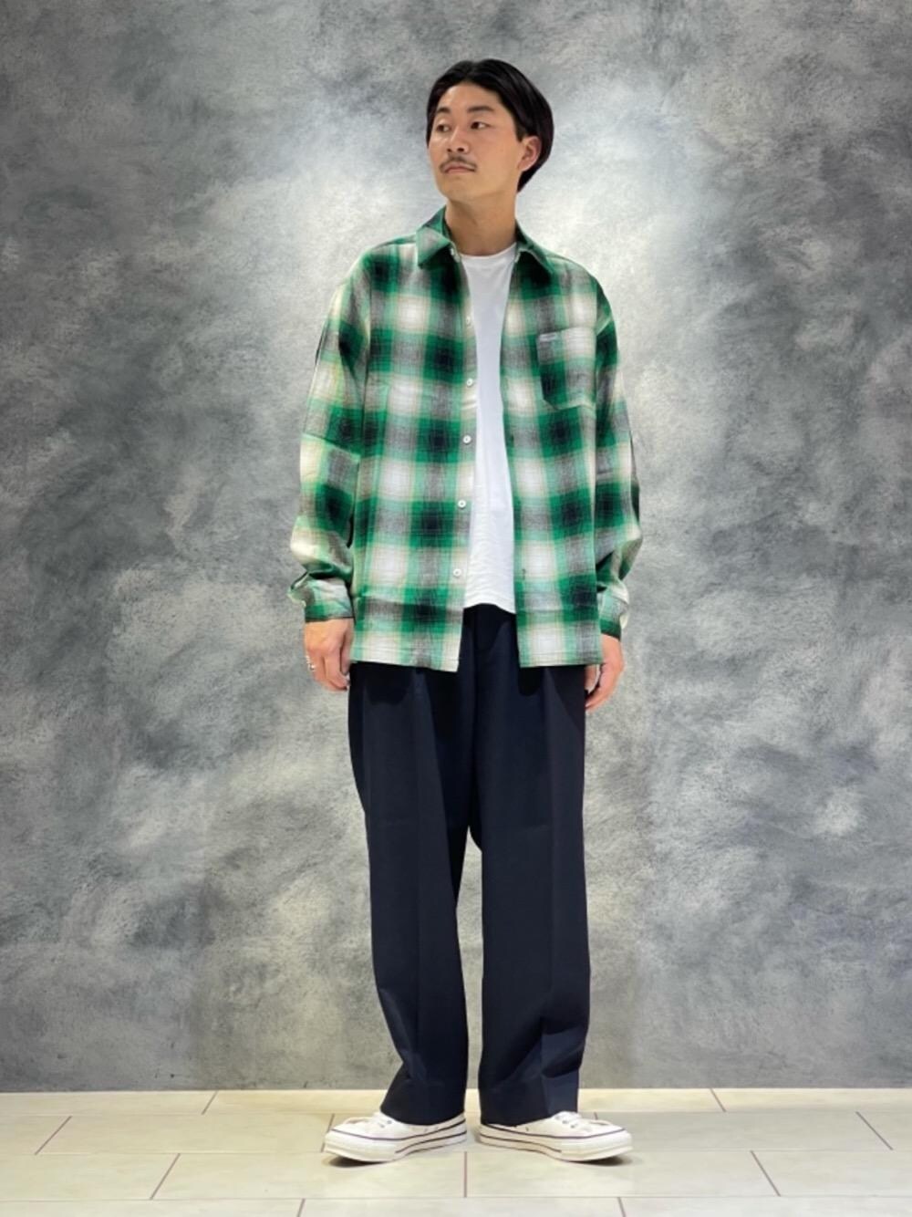 【身長】180cm(標準体型) 【普段サイズ】L/XL シューズ27.5/28.0cm 【サイズ感】 トップス:全体的にゆったりめなシルエットです。 ボトムス:ほんのりテーパードはありますが、ワイドストレートにちかいシルエットです。 (1214-186-8186-7990 ネイビーXL) シューズ:標準的です。 【素材感/着心地】 トップス:季節映えのする表面に毛羽感のある質感で、程よいハリ感もあるので、シルエットが綺麗に出ます。 ボトムス:生地に程よい重みがあり、裾にかけて綺麗に落ちるシルエットです。程よい光沢感があり、コーディネートに上品さをプラスできます。 【コーディネートポイント】 カジュアルな柄シャツにシルエットバランスの良い綺麗めなボトムスを合わせ、インナーとスニーカーをホワイトでまとめた爽やかな配色のコーディネートです。