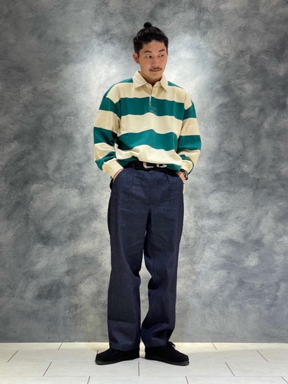 【身長】180cm(標準体型) 【普段サイズ】L/XL シューズ27.5/28.0cm 【サイズ感】 トップス:全体的にゆったりめのサイズ感です。袖丈少し長めですが、袖口にリブがあるので手元はスッキリと着用いただけます。 ボトムス:ほんのりテーパードの効いたワイドシルエットです。股上が深めなので、タックインもしていただきやすいです。 【素材感/着心地】 トップス:ハリ感と程よい厚みのある生地感です。 ボトムス:厚すぎない生地感で、リジットデニムのようなパリッとしたハリ感があります。 【コーディネートポイント】 カジュアルなアイテムを、タックインやスエードレザーシューズ等でカジュアルになりすぎないように意識しました。