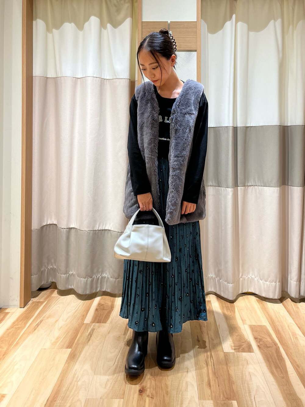 ご覧いただきありがとうございます💖 ファーベストが主役のコーデです☺︎︎︎︎ ふらふわサラサラで存在感のあるファーベストはいつものコーデにプラスするだけで華やかになります🌟 プリーツスカートとあわせて大人っぽくまとめました◎
