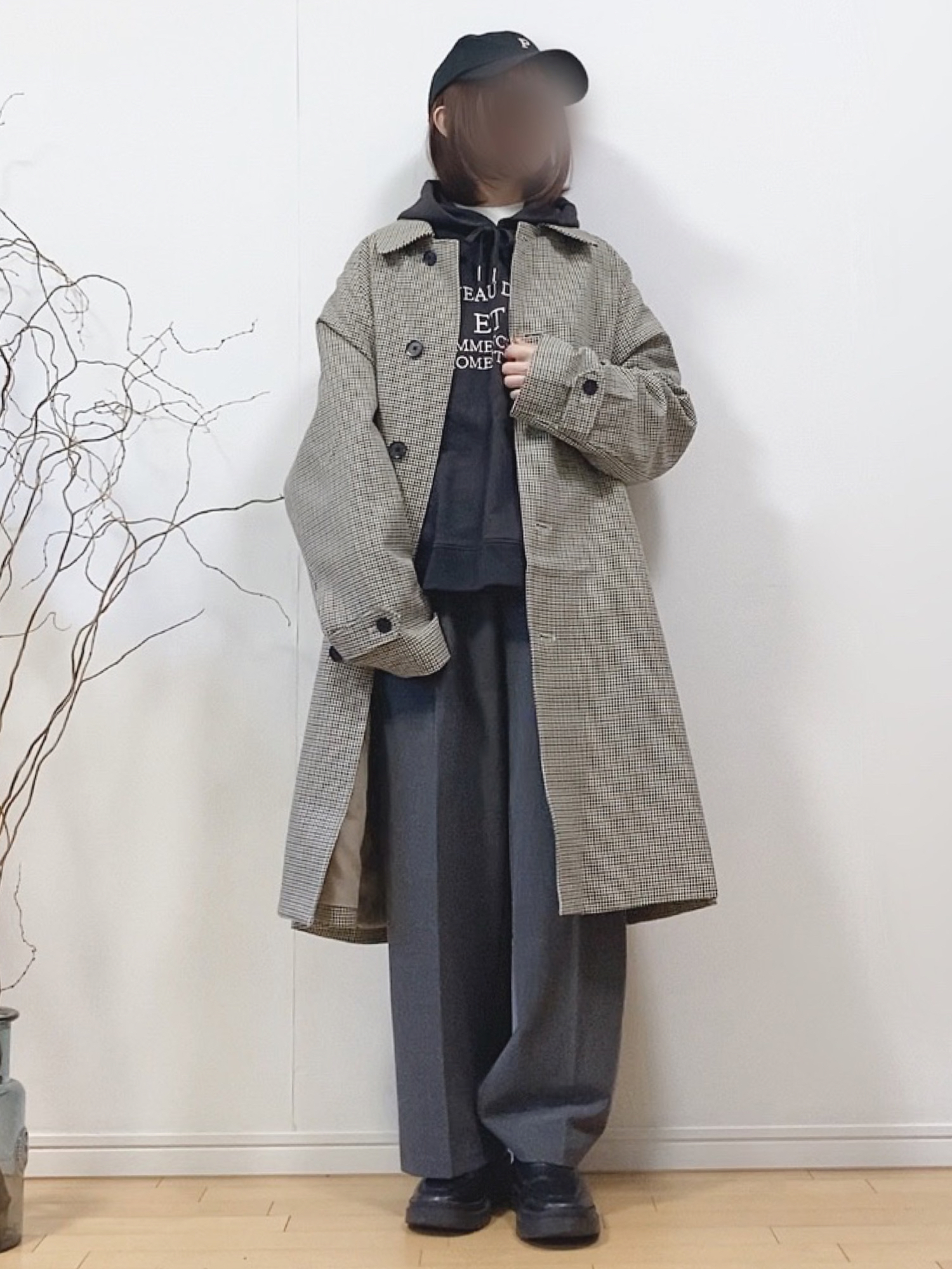 ご覧いただきありがとうございます🙇 メンズのチェックコートを使った ワントーンコーデ🧥 チラッと白で視線を上に。