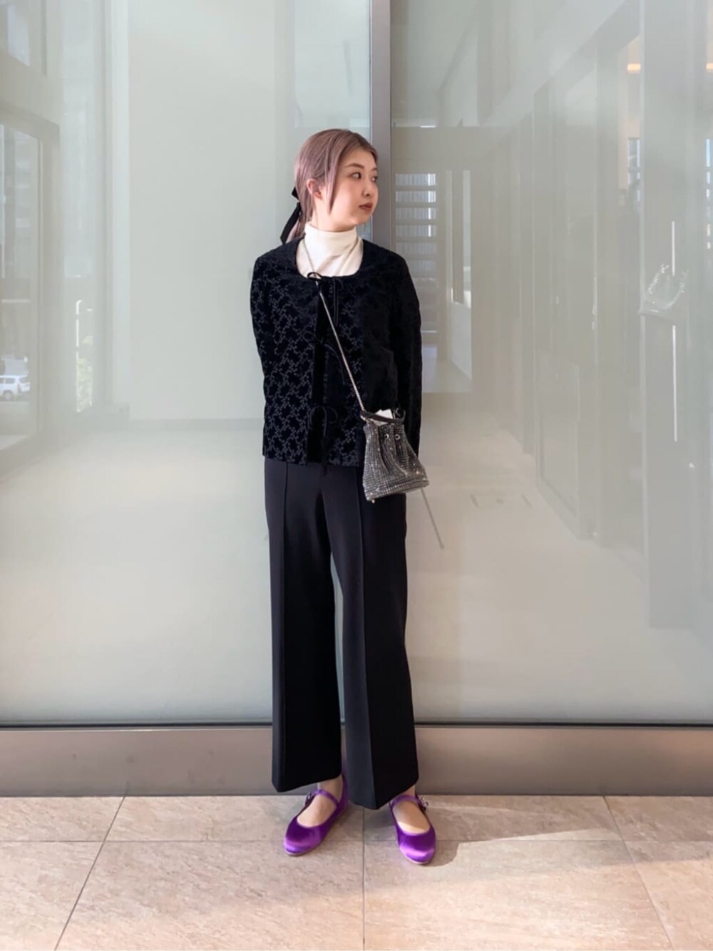 尾上こころ(ユナイテッドアローズ 名古屋駅店)のノーカラージャケット「ベルベット エンブロイダリーフラワーリボン ジャケット」を使ったコーディネート