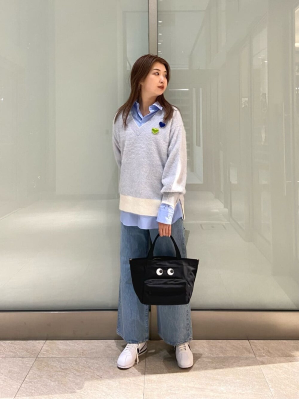 【サイズ感】 シャツ:ゆったりめ。 ニット:ゆったりめ。シャツにレイヤードをしていますが程よいゆとりがあります。 パンツ:標準的。ジャストサイズの為、緩く履くのであればワンサイズあげてもよさそうです。 全体的に淡いトーンでまとめ、スニーカーでコントラストをつけました。 ブローチもビビットなカラーを合わせているのでアクセントになっています。