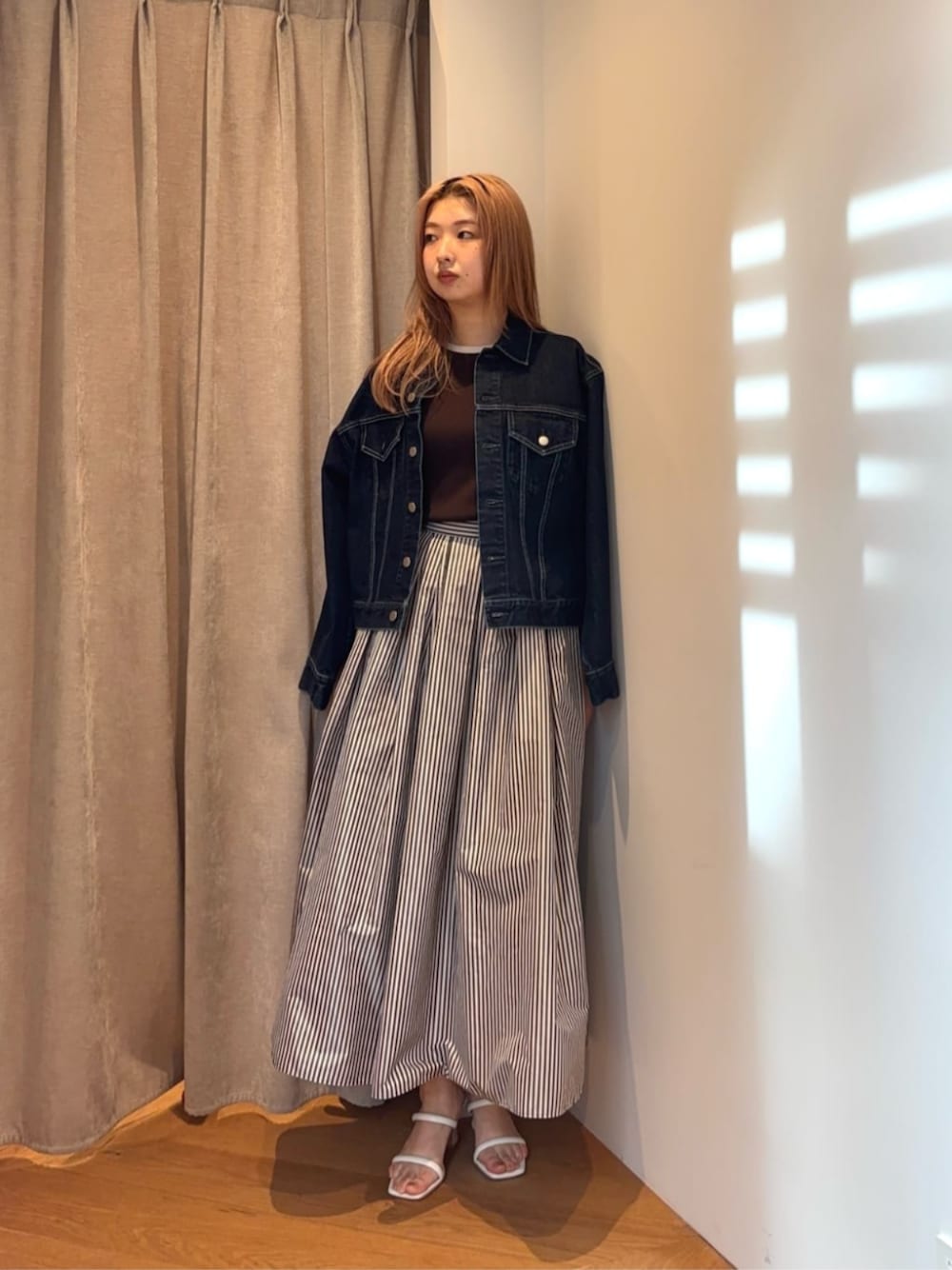 【サイズ感】 デニムジャケット:標準的 カットソー:標準的 ボトムス:標準的 ボリュームたっぷりなスカートにシンプルなカットソーを合わせました。タフタ素材のアイテムはカジュアルミックスするのがおすすめです。