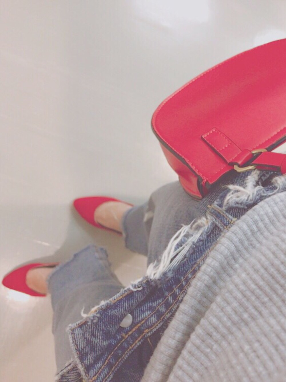 【 codenate 】 - - - - - - - - - - t-shirt : uniqlo damage denim : zara bag : zara shoes : global work 朱色をメインに。