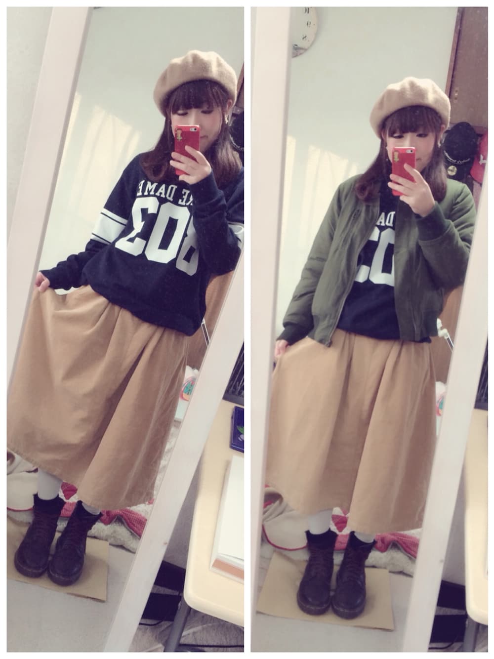 ベレー帽★雑貨店 スウェット★スピンズ LOWRYSのMA-1初披露でーす🙌💕 去年もMA-1ほしかったけど、同じ年にアウター2つも買うのはきついなーっと想って我慢し(学生なので💦)、今年やっとげっとしましたー!! 中がもこもこで肉厚なので、真冬でもいける♫♩ そして白タイツ(´,,•ω•,,`)♡ 去年まで白や薄グレーのタイツは膝上丈のスカートにしか合わせなかったけど、ロングスカートに白タイを覗かせるのもかわいいことが判明して、自分の中で新たな発見ーっ(﹡ˆoˆ﹡)