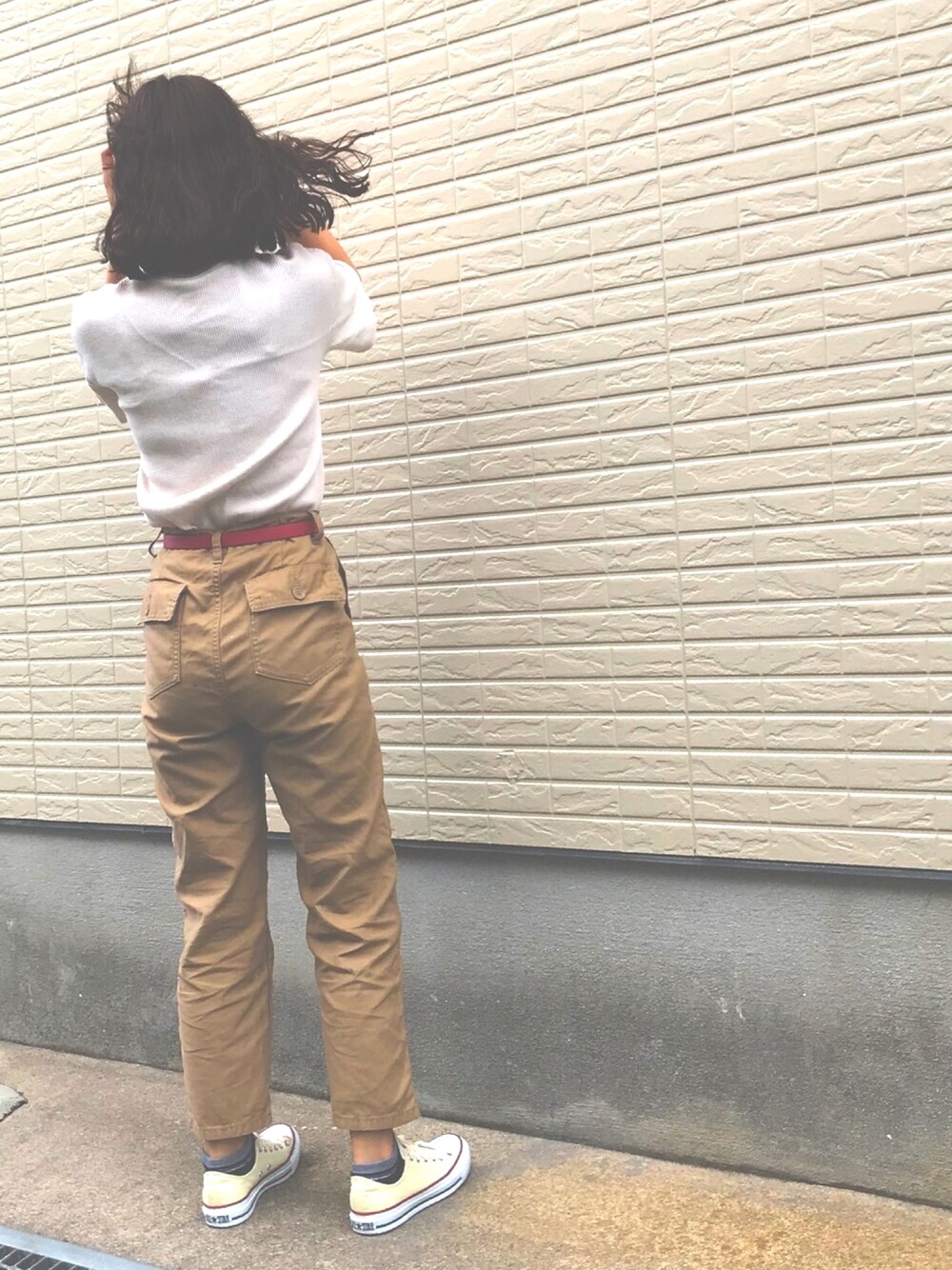 風が強かった日 🍃🍃😂 ベージュコーデ 🐻 GUのワッフルTは生地がしっかりしていて 透けにくくて安心 👶🏻♡ ベイカーパンツは着用するとこなれ感が出て良い🙆 赤のベルトでアクセントを🍒 コンバースもベージュにして ワントーンコーデに 🌙 そして髪の毛カット 💇🏻♀️ スッキリ 〜❣️