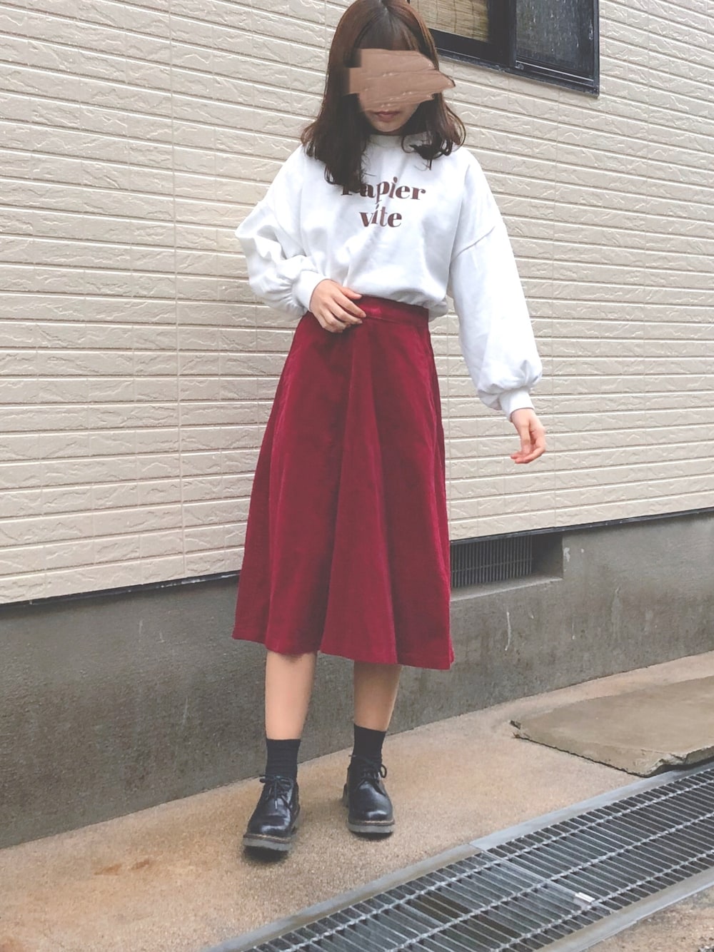 𓂃 𓈒𓏸 ご覧くださり、ありがとうございます🍒 ボルドーカラーのスカート可愛い💕💕 スウェットと合わせてカジュアルガーリーなコーデ♡ 似たものを持っているので、 コーデの参考にと複数タグ付けしています🌷