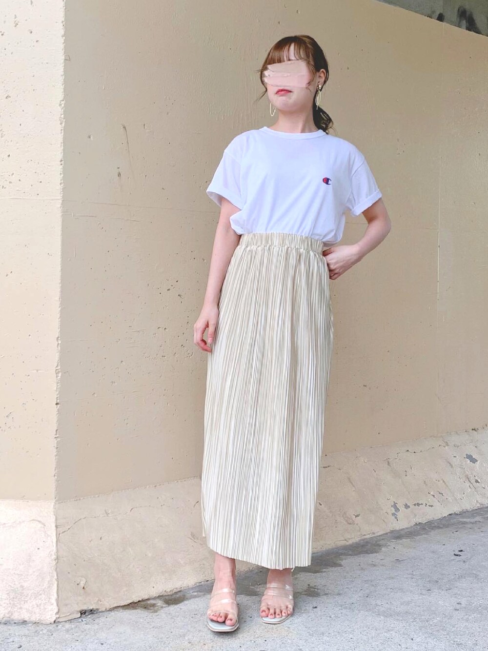 𓂃 𓈒𓏸 ご覧くださり、ありがとうございます🌿 チャンピオンのTシャツにプリーツタイトスカートを合わせた、カジュアルガーリーコーデです🐻🍒 ホワイトやベージュカラーでワントーンにして、柔らかい雰囲気にしてみました🐩🎀