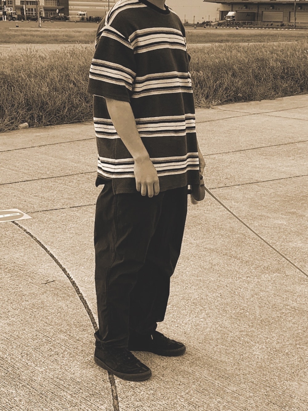 この写真は、9月下旬です。 サーフィンもしやすく、暑すぎないニットの半袖とユニクロのスラックスパンツで足元がNIKEのSBです。 ラフで着やすい。それが良い