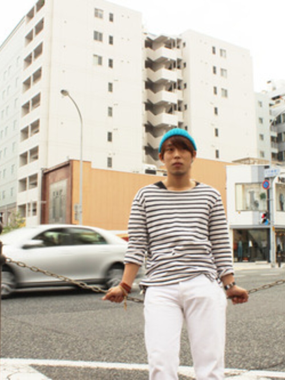 ブラック系のその他シューズ、ブルー系のニットキャップ/ビーニーを着用したメンズの夏コーディネートの1枚目の写真