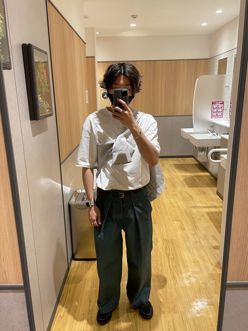 saby×dickiesのタックバギーパンツのグリーンを差し色に入れつつ今トレンドのたすき掛けをグレーのシャツで取り入れて遊び心出してみました😁バンツのシルエットと色味が最高でTシャツ1枚とでもかっこよく合わせられるので重宝してます。