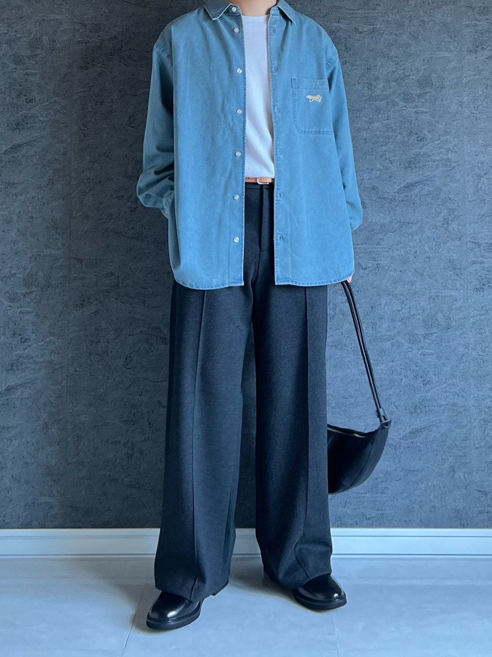 chika のシャツ/ブラウス「PENNEYS/ペニーズ 別注 THE FOX ロゴ ワンポイントワッペン刺繍 ヴィンテージ加工 オーバーサイズ レギュラーカラー デニムシャツ」を使ったコーディネート