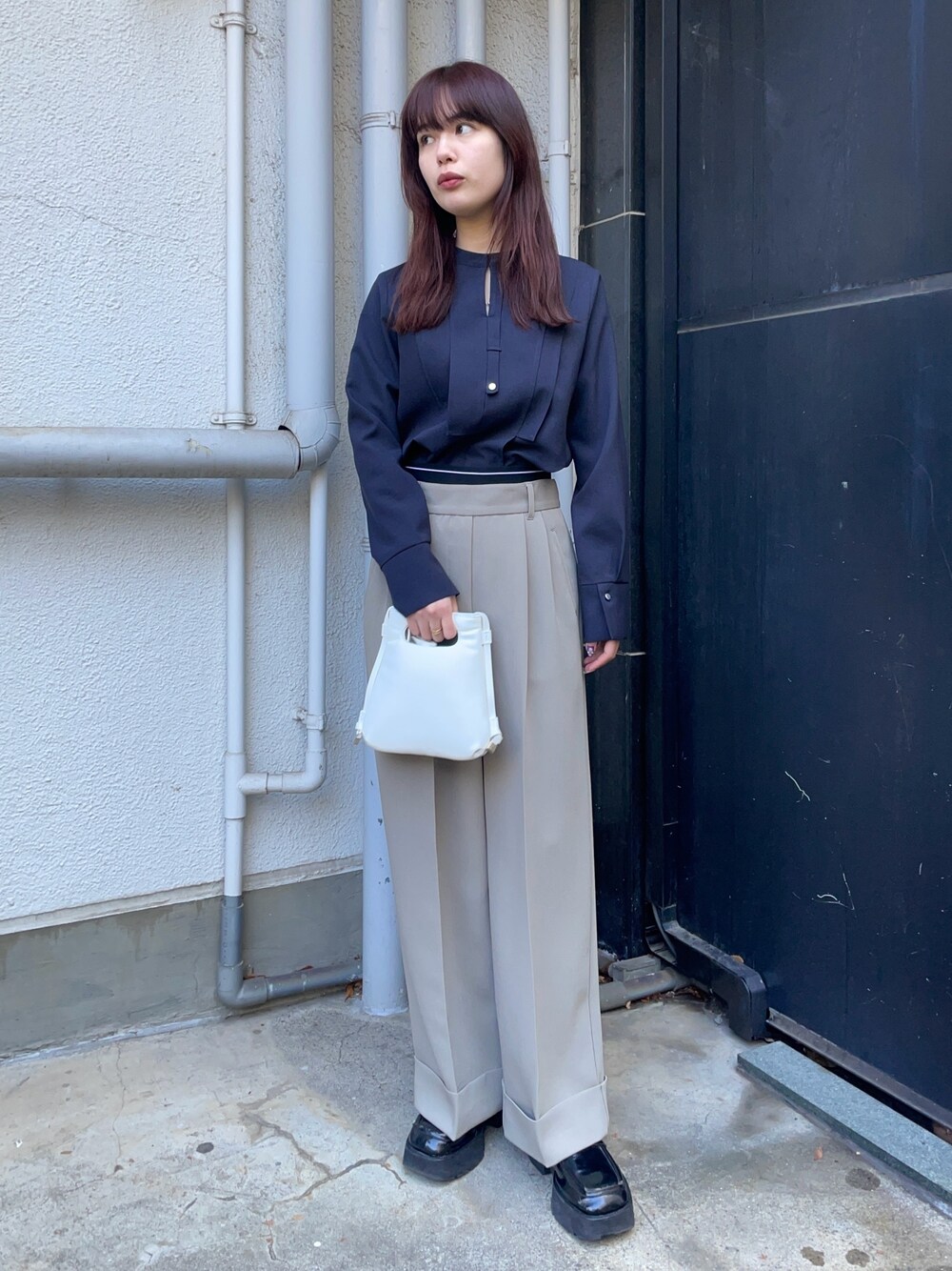 センタープレスがしっかり入った太めのストレートパンツにブラウスを合わせて、大人カジュアルなスタイルに♪