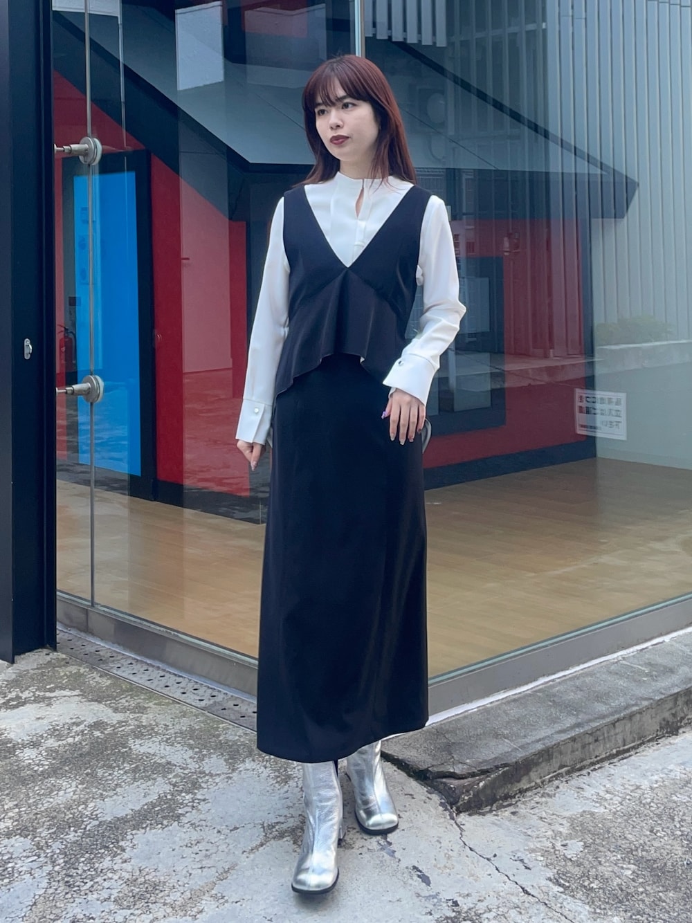 AKANE(UNITEDTOKYO 渋谷 W)のジャンパースカート「【残りわずか!】Vネックダブルクロスワンピース|ウォッシャブル/オケージョン/春服」を使ったコーディネート