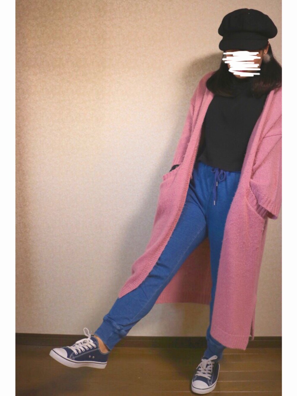暗めな格好にピンク色のロングカーディガンを差し色にしてみました!