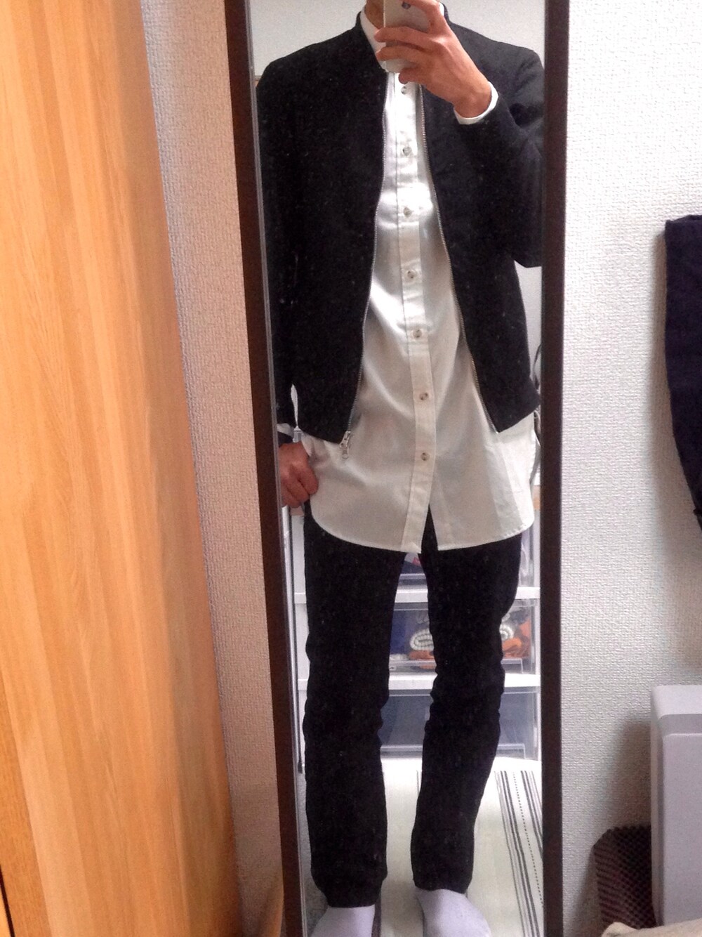黒のMA-1に流行りのロングシャツを合わせ、 黒と白で色もシンプルにまとめました! 初投稿ですがよろしくお願いします!