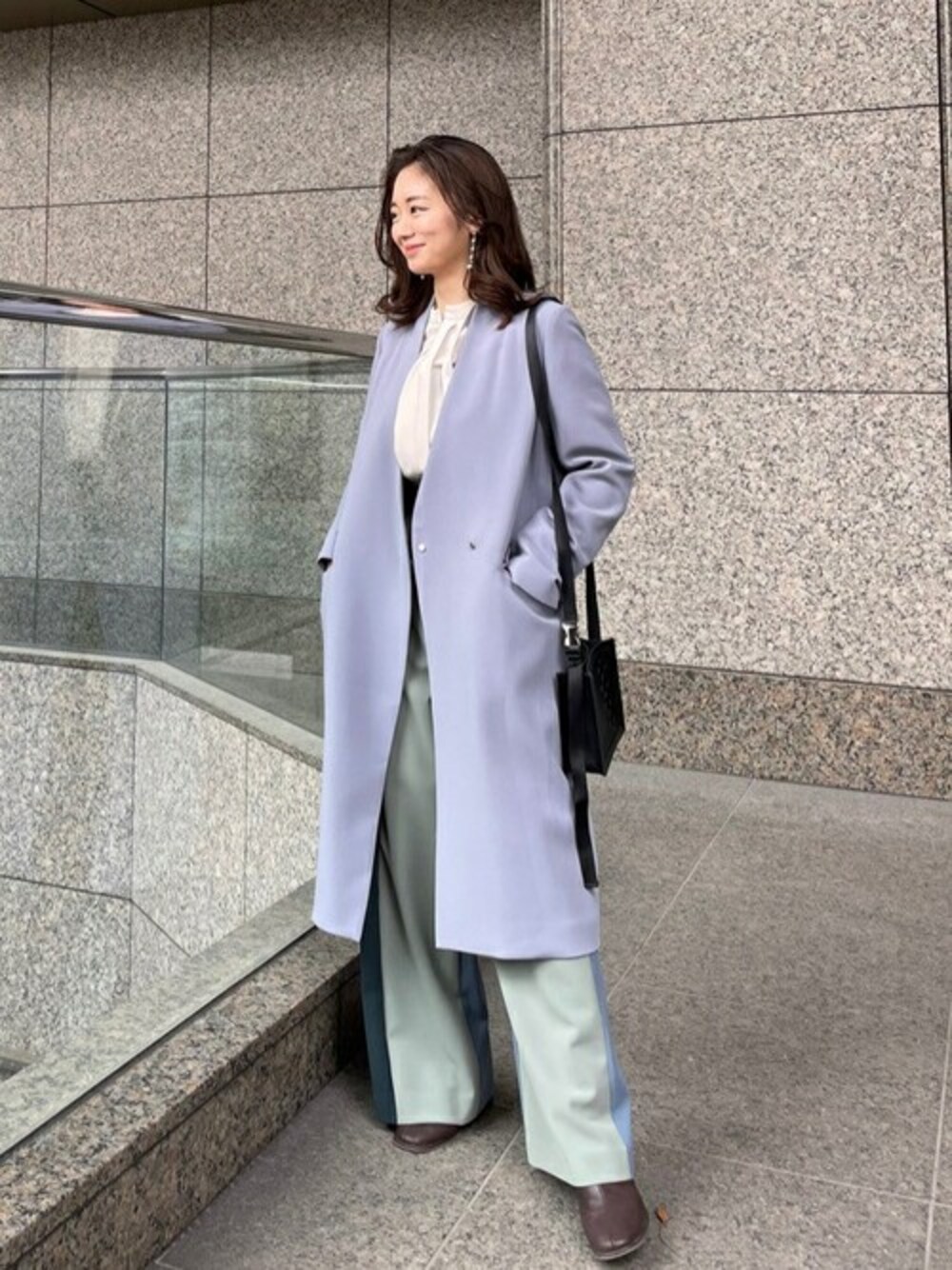 淡いカラーで春をイメージしました。 コートは軽くて肩がフィットするので華奢見えします!パンツは被らないカラーです!
