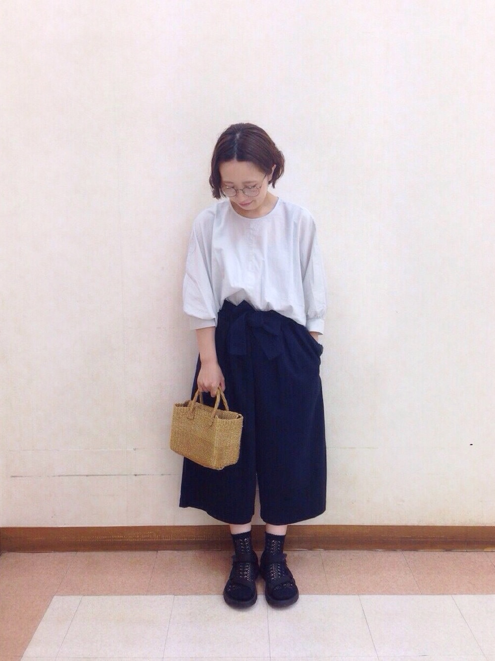 イ ズ ミのシャツ/ブラウス「コットンキュプラローンクルーネックブラウス」を使ったコーディネート