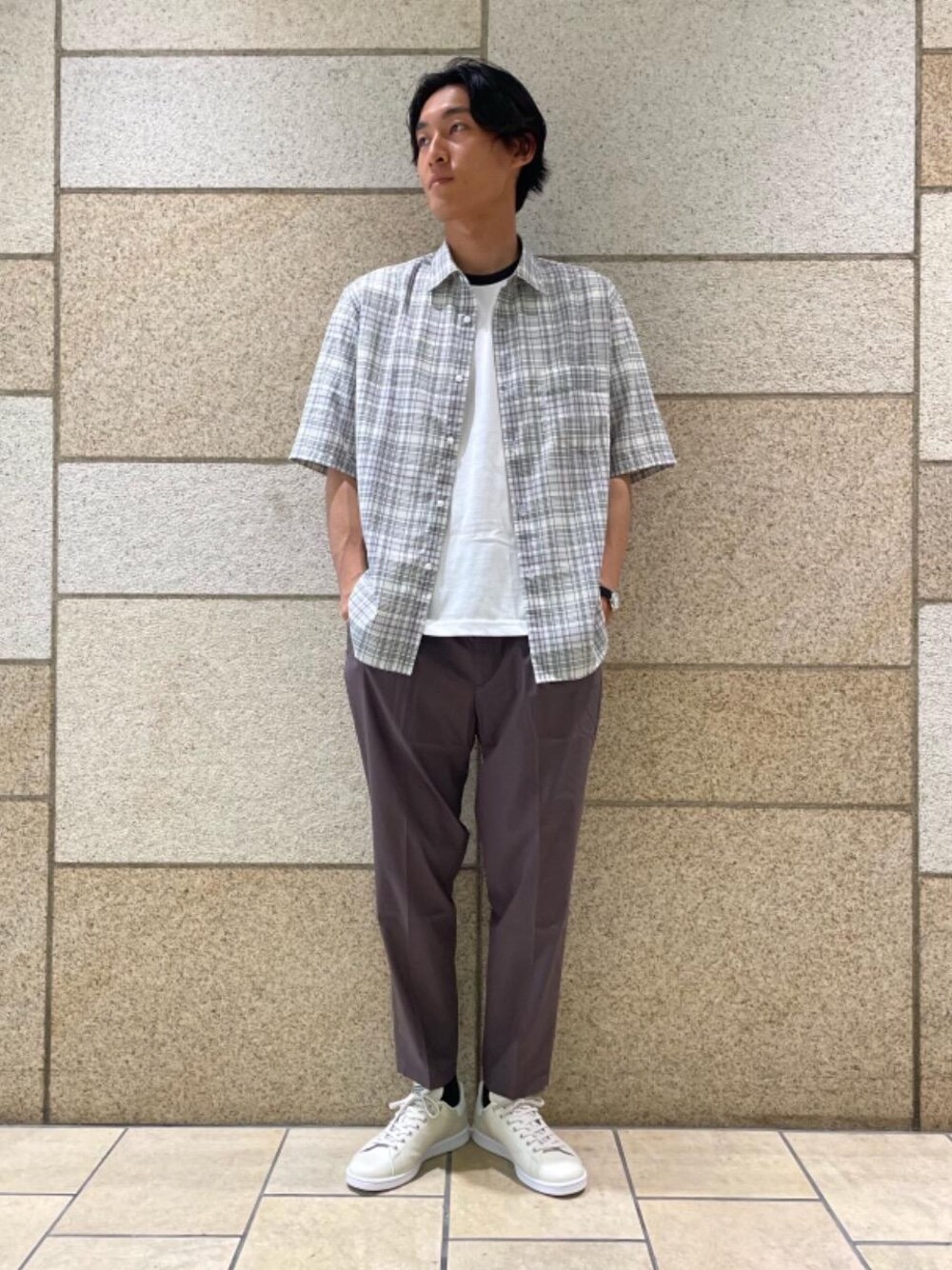 身長:185cm 普段のサイズ:シャツXL TシャツXL パンツXL シューズ28.5cm [サイズ感] シャツ:ゆったり Tシャツ:ややゆったり パンツ:標準的 [素材感] シャツ:薄手 パンツ:ややハリあり [着心地] シャツ:軽くてストレスなく着れる パンツ:アンクル丈で足元がすっきり [コーディネートポイント] クリーンな印象を与えるチェックシャツとカジュアルなリンガーTシャツを組み合わせました。しっかりとハリ感のあるスラックスも薄手で暑い時期に重宝すると思います。 さらに全体的にカジュアルに寄りすぎるこの季節ですが、BY別注のスタンスミスは上品さもあるスニーカーでおすすめです。