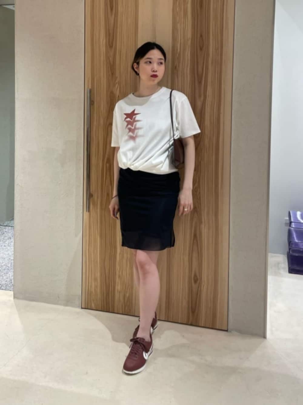 【サイズ感】 トップス:ゆったり ボトムス(ワンピース):36を着用。タイト シューズ:普段サイズ 【コーディネートポイント】 ワンピースの上からTシャツを合わせてスカートっぽく着用し、カジュアルに着こなしました。 Tシャツはオーバーサイズのものの裾をヘアゴムで留めて着丈を短めにアレンジしてみました。