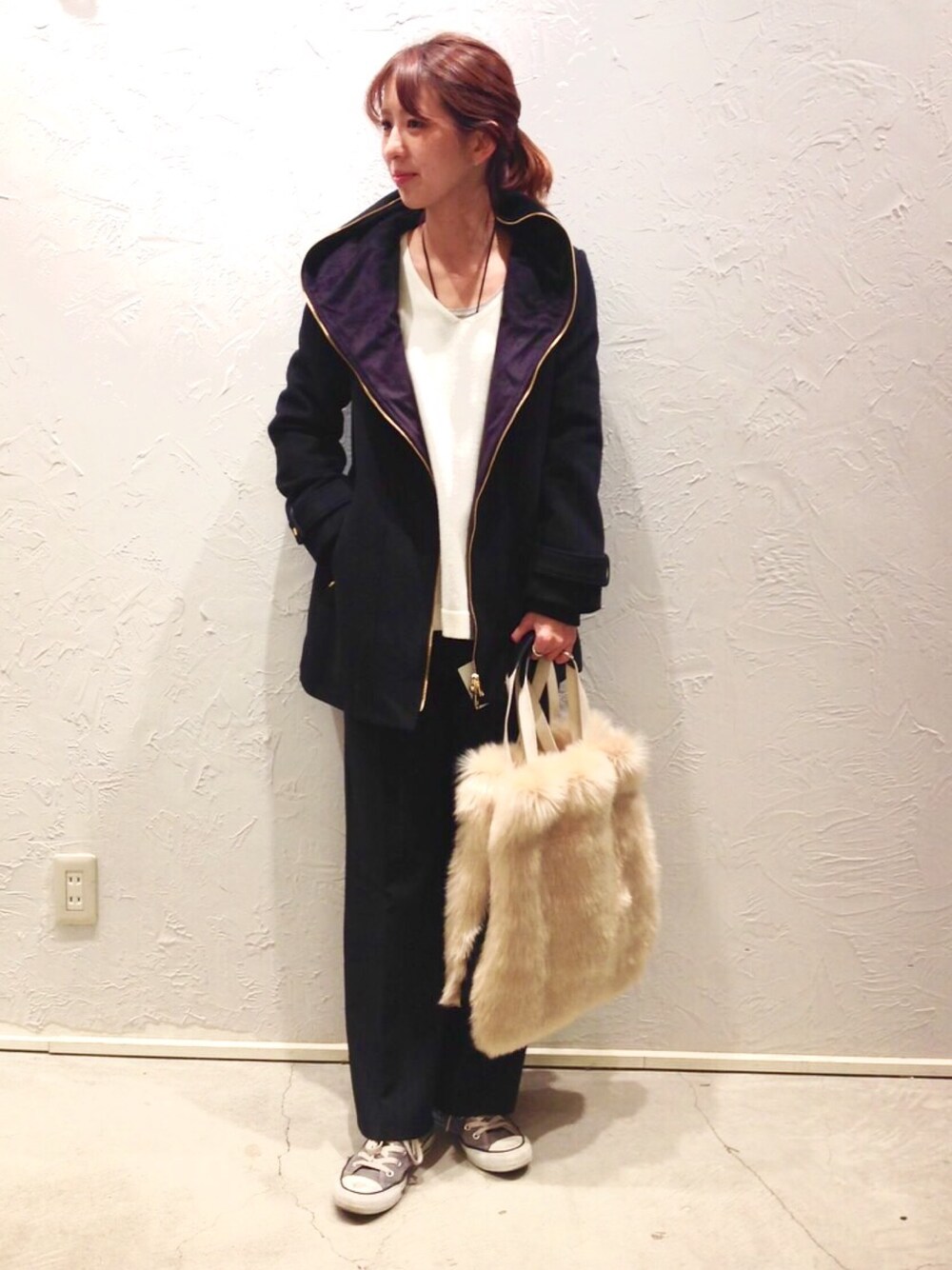 actuelで大人気のアウターコーデ🙆✨✨ アウターは在庫が残りわずかです🎵 軽くてデザインもお洒落なアウターでヘビロテ中です😌💕 ファーBAGとスニーカーでカジュアルめに着てみました🎵
