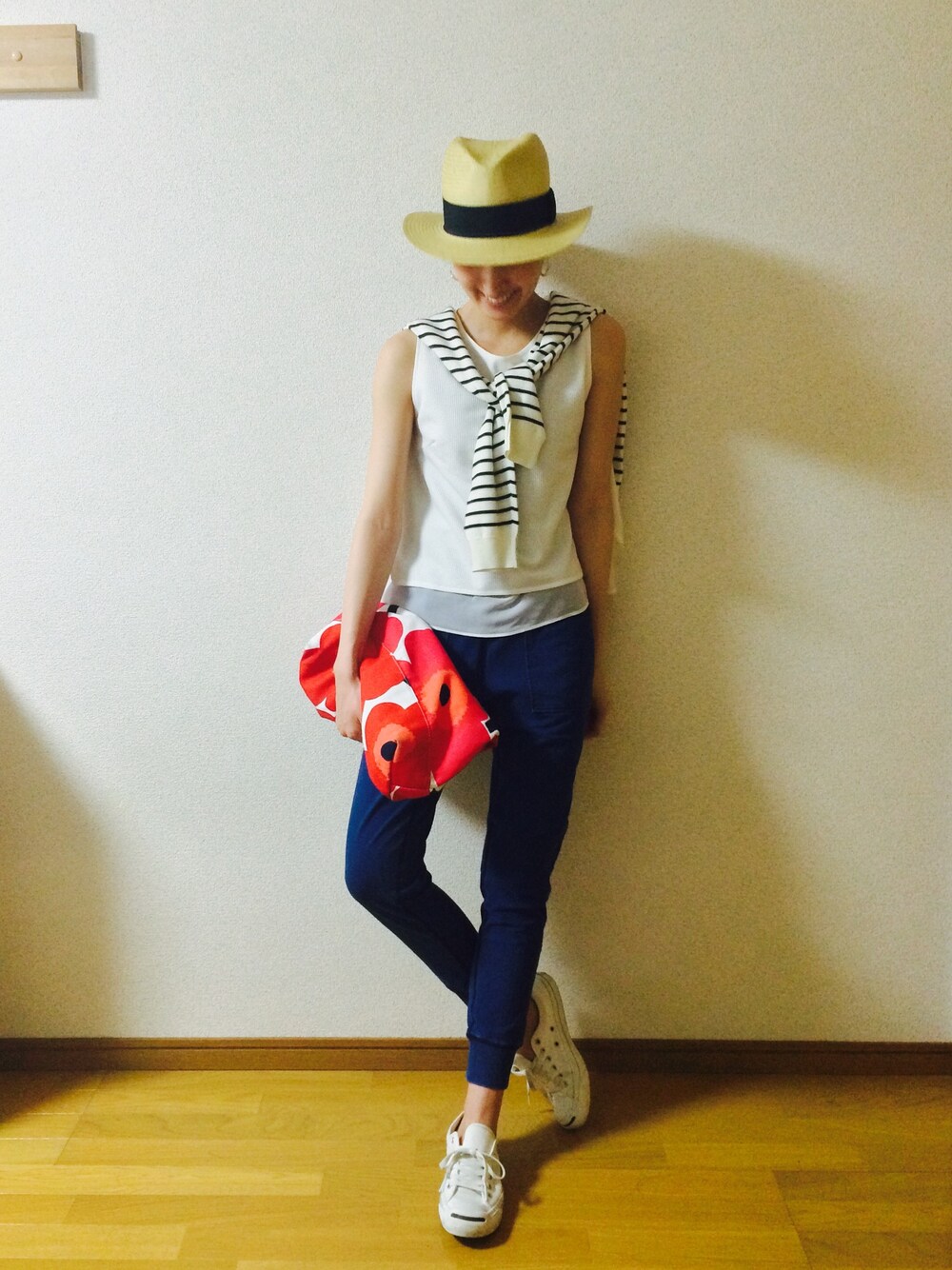♡、save、comment、follow ありがとうございます☺️💕 うれしいかぎりです〜 さてさて今日も暑いですね〜☀️☀️ GUでゲットしたデニムスウェットパンツをおろしてみました👖✨ 楽やし可愛い〜笑 マリメッコのトートをクラッチ持ちしてポイントに☺️👌
