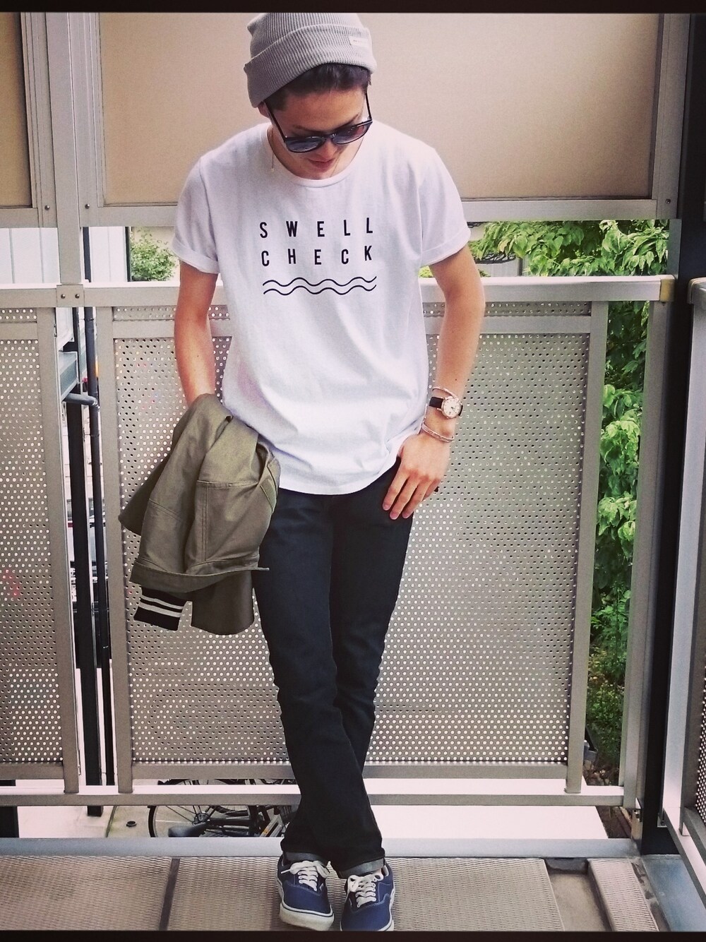 Tシャツにデニムの王道スタイルにシャツを着るでもなく、捲くでもなく、持つ!!笑 このシャツ袖がギュッとなってます。