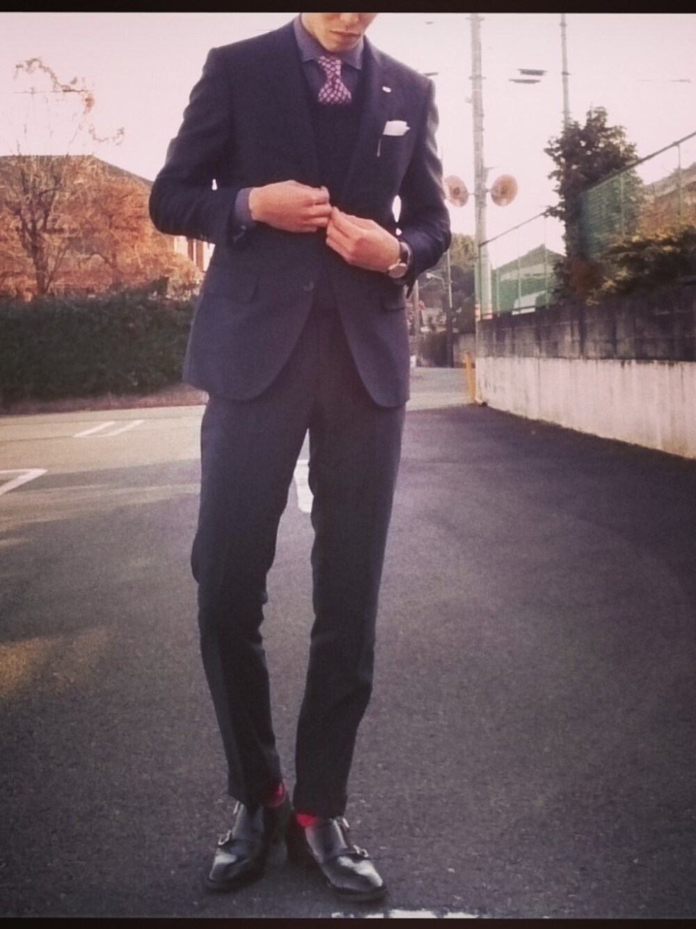 HILTONの紺無地スーツに、nextblueのドレス、スーツカンパニーのネクタイ。 全て自社製品になります。 カラーソックスがアクセント。 お気に入りのダブルモンク。