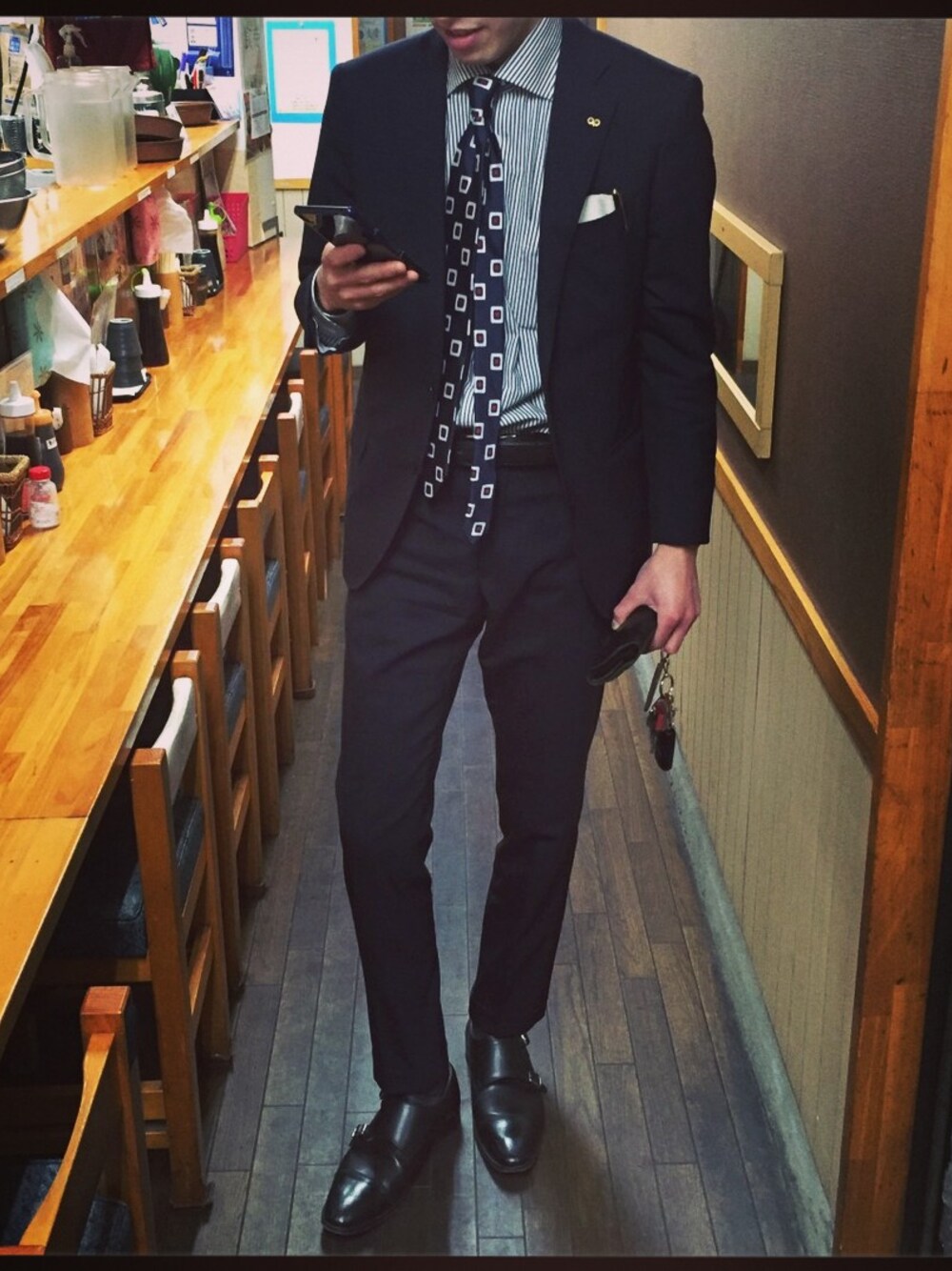 仕事終わりに、同期と行きつけのとんかつ屋へ。 落ち着いてご飯を食べれる唯一の場所。 紺無地に、レトロ柄ネクタイ。