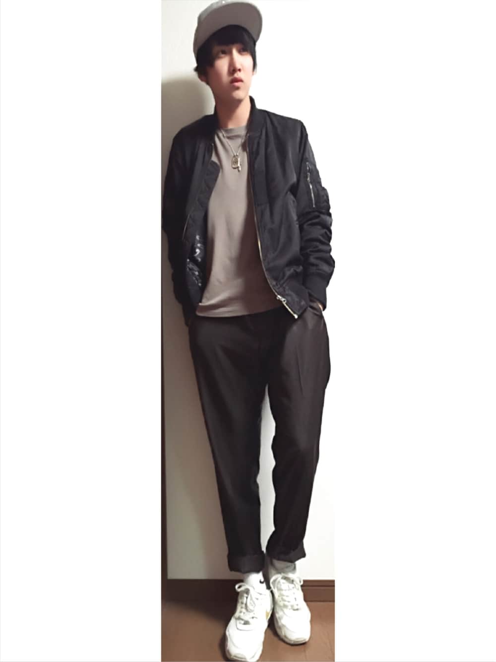 MA-1ジャケットを使ってキレイめカジュアルなコーデにしてます。ロールアップでナイキのロゴを見せてます。 キャップでスポーツ感を増してます! スラックスはいろんなコーデに取り入れやすくとてもお気に入りでよく使ってます!! シンプルな色がすきです。