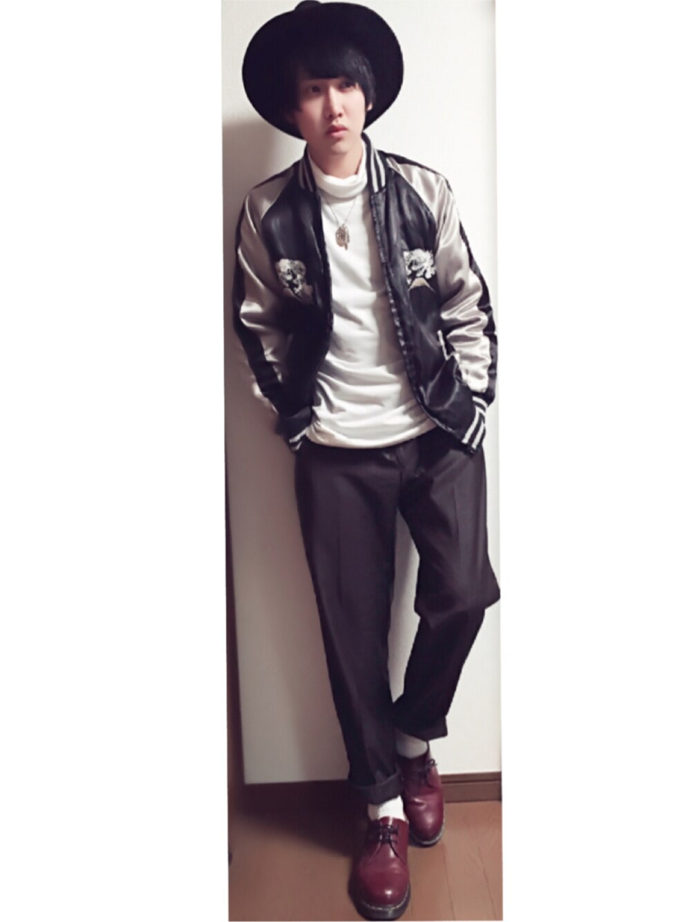 古着のスカジャンを使ったキレイめコーデ。 タートルネックと合わせると相性がいいです! 差し色にドクターマーチンのワインレッドをいれてます。ロールアップして足元をみせてスッキリ見せてます。つば広ハットで目線を上に上げてスタイルをよく見せるようにしてます。
