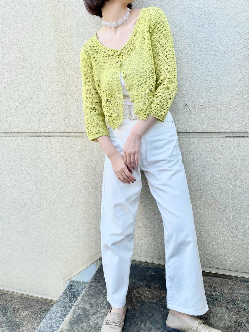 黄色と黄緑の間カラーのかぎ針編みトップス×ホワイトデニム